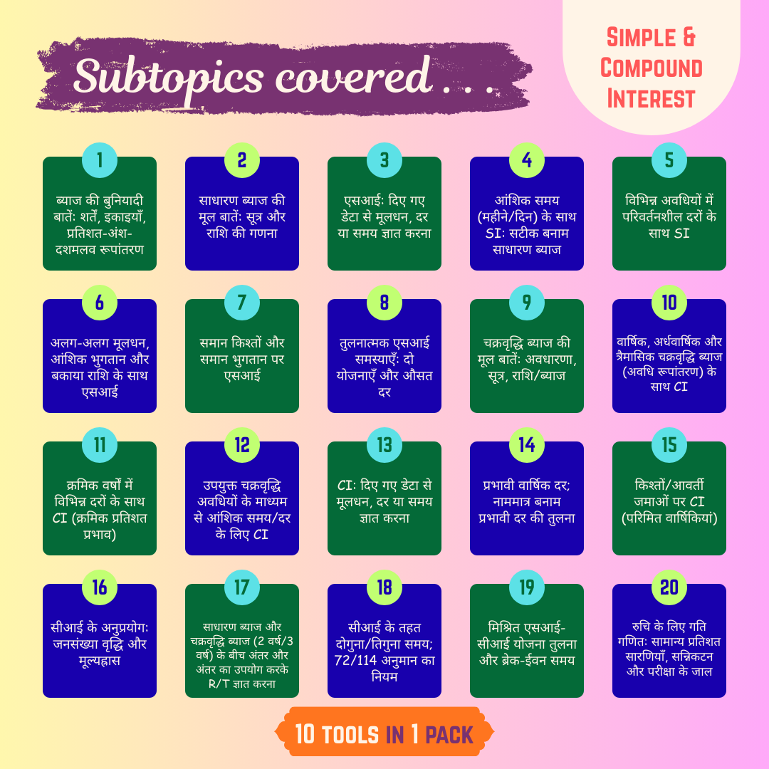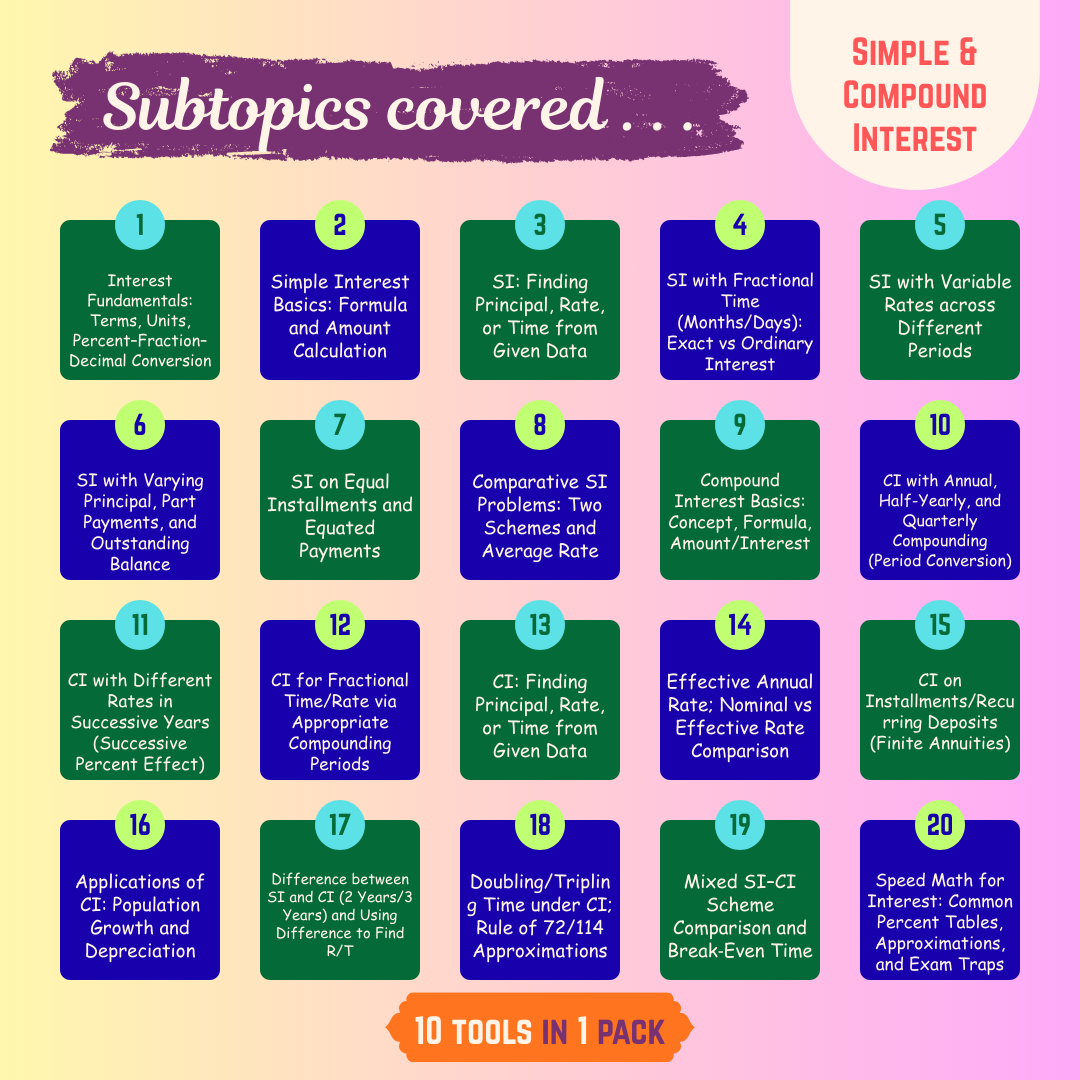 • 20 subtopics of Simple & Compound Interest
